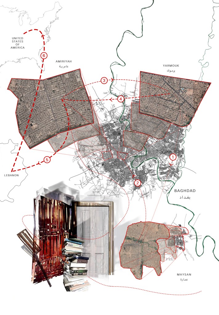 Zeinab’s map oscillates between refuge and trauma as her life was constantly threatened by violence due to her father’s activism and refusal to join the Ba’ath Party while being a well-known radiologist in one of Baghdad’s main hospitals, Yarmouk, and being an active member of the Communist Party. They moved across Iraq from south to north with her father’s medical service. Over the years she confronted violence inflicted by different groups with different allegiances while taking refuge in writing and her father’s library and books. Before having to flee the country at the height of sectarian violence, she faced what looked like, as she describes it, an Afghan militant running in their street in Baghdad holding a machine gun, who saw her peeking through the gate. Knowing that the Amiriyah district is a Shia neighbourhood he (a Sunni militant) nevertheless chose to spare her the bullet.