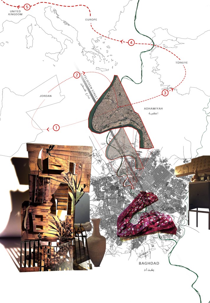 Originally from the highly dense mixed neighbourhood of Adhamiyah in Baghdad, Basma’s marital and social life compounded with violence on the streets of Baghdad drove her to leave the country taking risky and treacherous routes into the UK with her young daughter. Basma Al-Azzawi, is a Baghdadi ceramicist and currently a single mother seeking asylum in the UK. Her map records the multiple attempts to escape violence, domestic and urban, with her daughter, as they crossed national and international, soft and hard, borders, leaving behind a career in pottery and a social life that she still yearns for.
