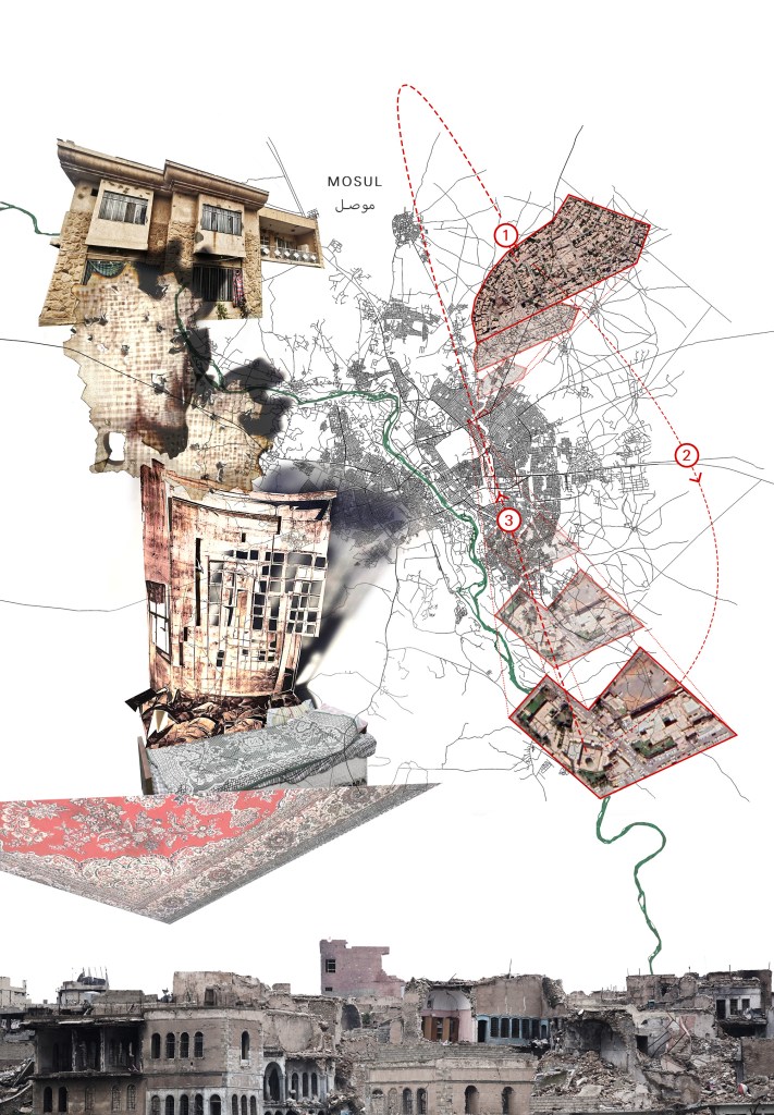Ali Al-Baroodi, from Mosul, is a photojournalist expert on Mosul, translator and an academic at the Department of Translation, Mosul University. Ali’s map is a homage to home, a home lost and re-found after enduring multiple traumas materially and conceptually during the Battle for Mosul in 2014. The map shows the moment shrapnel entered the window of Ali’s room marking the beginning of multiple traumas over the months of ISIS attacks in Mosul.