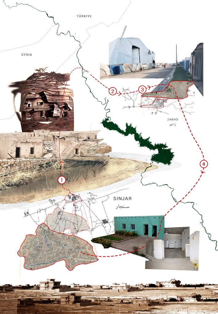 Amera Ibrahim is a biologist who at the time of interview was working as an associate for Sinjar Academy (a charity supporting the education of Yazidis in Iraq) who is originally from the North of Sinjar. Born shortly before 2003 in Sinjar, Amera’s encounter with violence and trauma was at the hands of ISIS in 2014. Her map charts multiple journeys of displacement between camps in the North of Iraq moving from tents to cabins, until a return, against all odds, back to Sinjar.