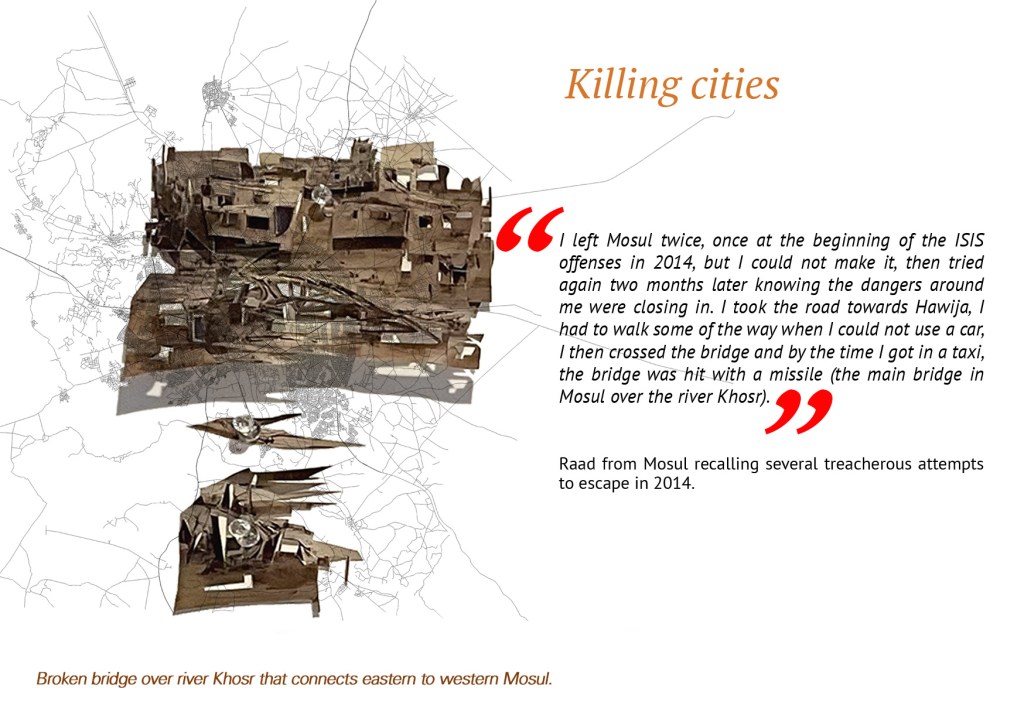 Raad shared several photos that span the personal scale and the city scale. The urban photos reflect the change of use of houses that were once sought after because of their central location on main roads. These lost their value after ISIS attacked the city as they became the most vulnerable of all houses and endured a significant amount of damage and later a change of use. A selection of other photographs depicts the material effects of war on the city in the form of a return to old, pre-electricity tools and equipment for storing drink or cleaning the house.