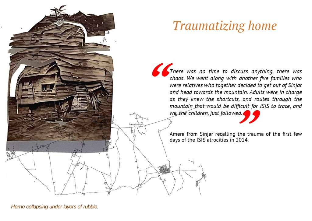 Amera shared photographs from four different places of refuge with varying degrees of quality of life throughout her journey of displacement. When ISIS struck in 2014 she was forced to leave her home in Sinjar and move to a tent in camp Bersive in Zakho. This was followed by a metal cabin in camp Rwanga in Duhok for five years before returning to a different house in Sinjar as one of the first families to return after the genocide.